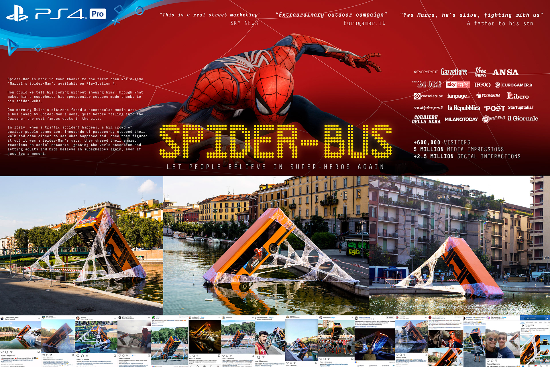 For the latest PlayStation game Marvel's Spider-Man we created a giant ambient media art along the Darsena, one of the most touristic and iconic place in Milan, it's a spectacular rescue made by our superhero under the eyes of thousands of people.