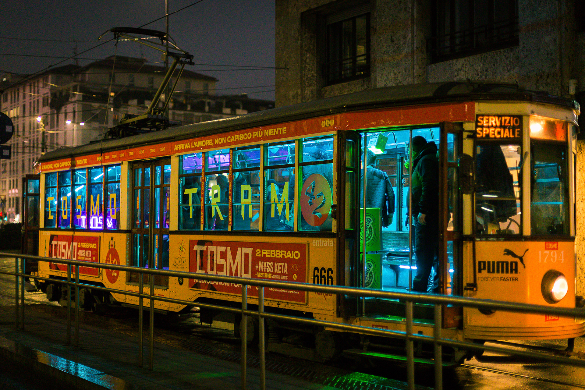 Tuborg presents Cosmotram, the first dj set on a tramline. 27-01-2019, Milan, Italy. Cosmo | Myss Keta | Ivreatronic